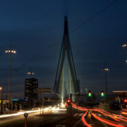 De Erasmusbrug bij avond, gezien vanaf het Wilhelminaplein op de Kop van Zuid. Deze foto is in twee delen gemaakt om de lampen van de auto’s van beide kanten vast te kunnen leggen.