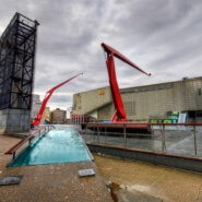 Het plein dient als een stadspodium met als decor de dynamische skyline. Het plein is verhoogd en fungeert als dak voor de onderliggende parkeergarage. Er zijn verschillende materialen gebruikt: hout, rubber, epoxy en metaal. Heel leuk allemaal, maar zodra het regent, of erger ijzelt, wordt het plein spiegelglad…